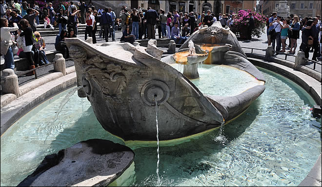 La fontaine de la barcaccia, a été commandée par le pape Urbain VIII à Bernini (père du Bernin). Cette fontaine, originale, représente une barque prenant l'eau. Elle a été placée dans une fosse pour palier au problème de pression d'eau alimentant la fontaine. La fontaine porte les armes de la famille du pape, les Barberini, symbolisées par des abeilles.