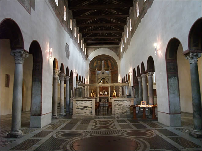 Un plafond plat en bois couvre l'église, typique des basiliques byzantines. Santa Maria in Cosmedin est un excellent exemple d'architecture d'une basilique antique d'influence byzantine.