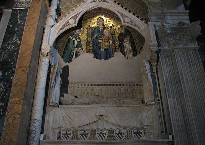 A côté de la chapelle, un très beau tombeau d’un évêque, surmonté d’une mosaïque représentant une Vierge à l’enfant.